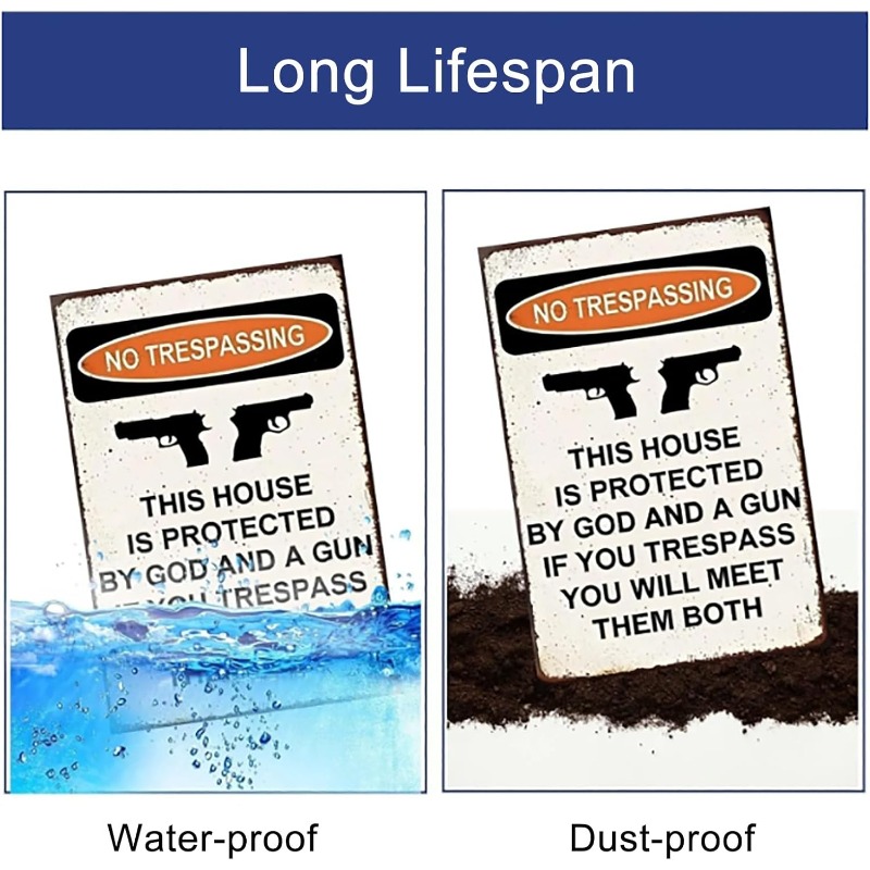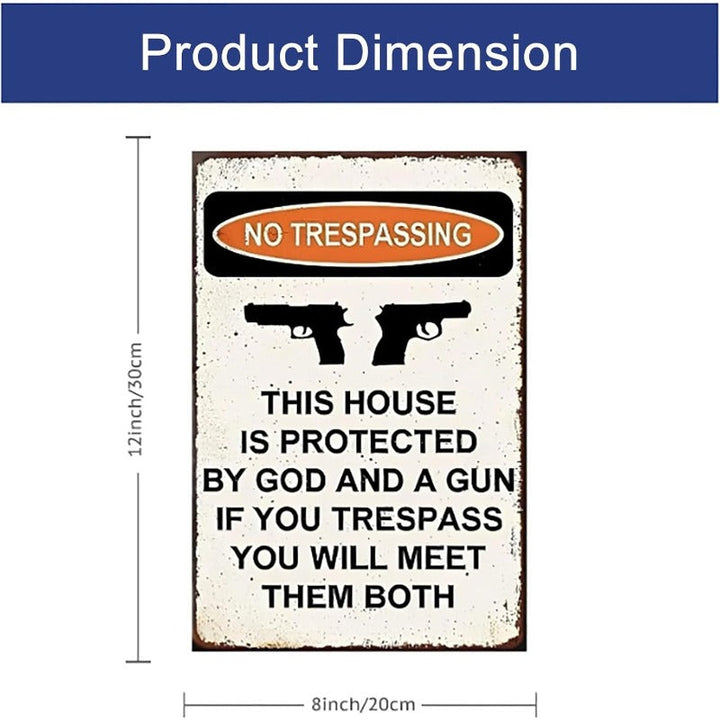 Show your beliefs and protect your property with this durable No Trespassing Metal Sign. Featuring bold black letters and a vintage weathered look, it sends a clear message with a touch of American humor: “This house is protected by God and a gun. If you trespass, you will meet them both.”