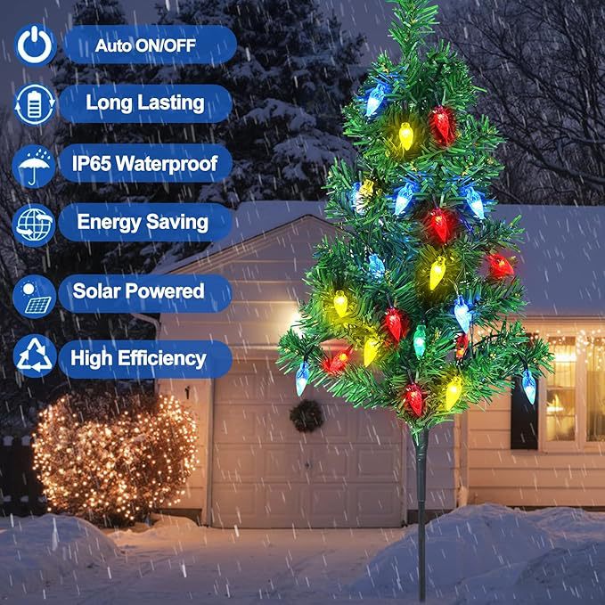 Each tree stake stands 29 inches high and comes with 20 multi-color C6 strawberry LED bulbs. The set includes 4 trees connected by 6.56ft spacing, plus 6.56ft lead wire, delivering a dazzling festive glow for your yard, garden, or pathway.